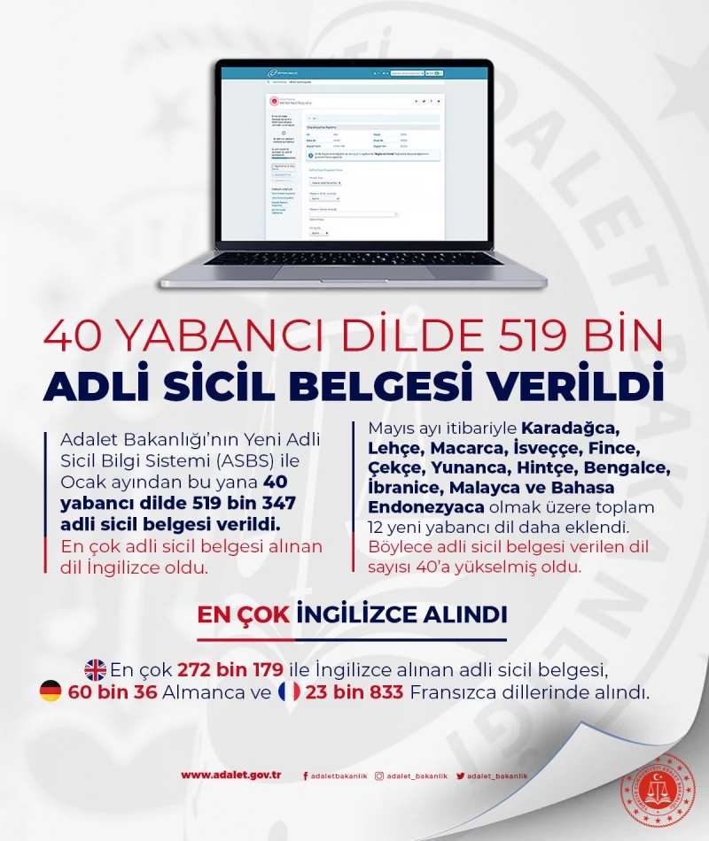 Adalet Bakanlığı’nın Yeni Adli Sicil Bilgi Sistemi (ASBS) ile Ocak ayından bu yana 40 yabancı dilde 519 bin 347’ye adli sicil belgesi verildi. En çok adli sicil belgesi alınan dil İngilizce oldu.