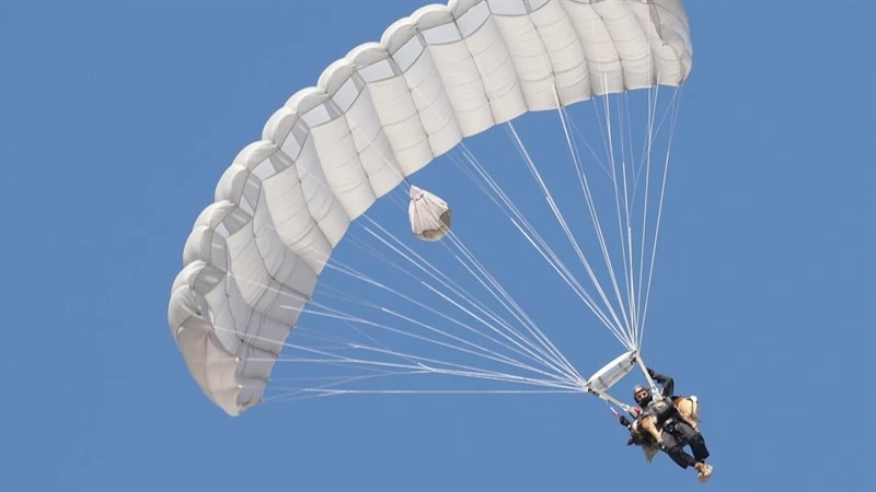 Yerde iniş yapılacak bölgenin belirlenmesinin ardından paraşüt harnesiyle bağlı olduğu operatörüyle helikopterden atlayan Maça, gökyüzünde bir süre süzüldükten sonra başarılı şekilde yere indi.
