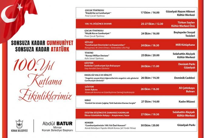 17 Ekim’de Güzelyalı Nazım Hikmet Kültür Merkezi’ndeki “Küçük Kız ve Cumhuriyet” isimli çocuk tiyatrosuyla başlayan etkinlikler, 24 Ekim’de Milli Kütüphane’de düzenlenecek “Cumhuriyet Devrimleri ve Kazanımları” söyleşisiyle devam edecek. İzmir Milli Kütüphane Vakfı Başkanı ve Konak Belediyesi Meclis Üyesi Ulvi Puğ’un yöneteceği söyleşide Tarihçi Yazar Doç. Dr. M. Emin Elmacı konuşacak. “Küçük Kız ve Cumhuriyet” çocuk tiyatrosu, 24 Ekim’de Beştepeler Sosyal Tesisleri’nde tekrar sahnelenecek. Kutlamalar kapsamına, “Kuvayi Milliye Destanı” isimli tiyatro oyunu Selahattin Akçiçek Gösteri Merkezi’nde 25 Ekim’de sahnelenirken, 26 Ekim günü “Kadınlar Cumhuriyet İçin Buluşuyor” isimli step, aerobik dans gösterisi Güzelyalı Denizatı Parkı’nda yapılacak.