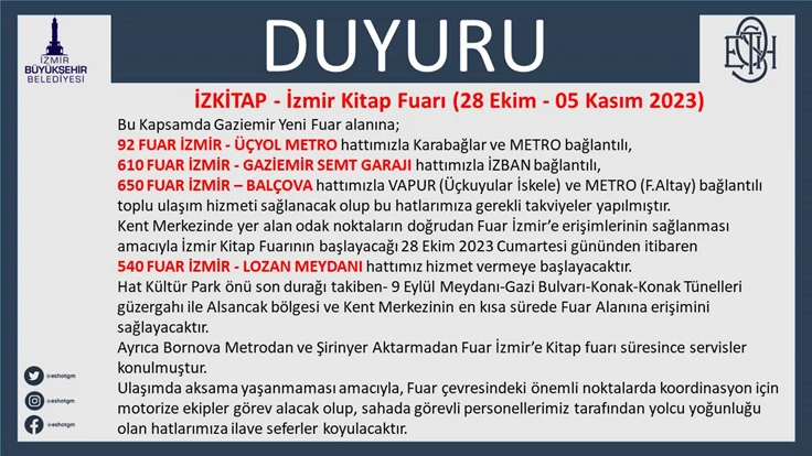ESHOT Genel Müdürlüğü, 28 Ekim-5 Kasım tarihleri arasında yapılacak İZKİTAP-2. İzmir Kitap Fuarı için sefer düzenlemesi yaptı. Fuar İzmir’e ziyaretçilerin rahat ulaşmasını sağlamak amacıyla mevcut 92, 610 ve 650 numaralı hatlara, Lozan Meydanı’ndan hareket edecek 540 numaralı geçici hat da eklendi. Üniversitelilerin kolay ulaşımı için de Bornova Metro ve Şirinyer’den geçici servis hatları oluşturuldu.